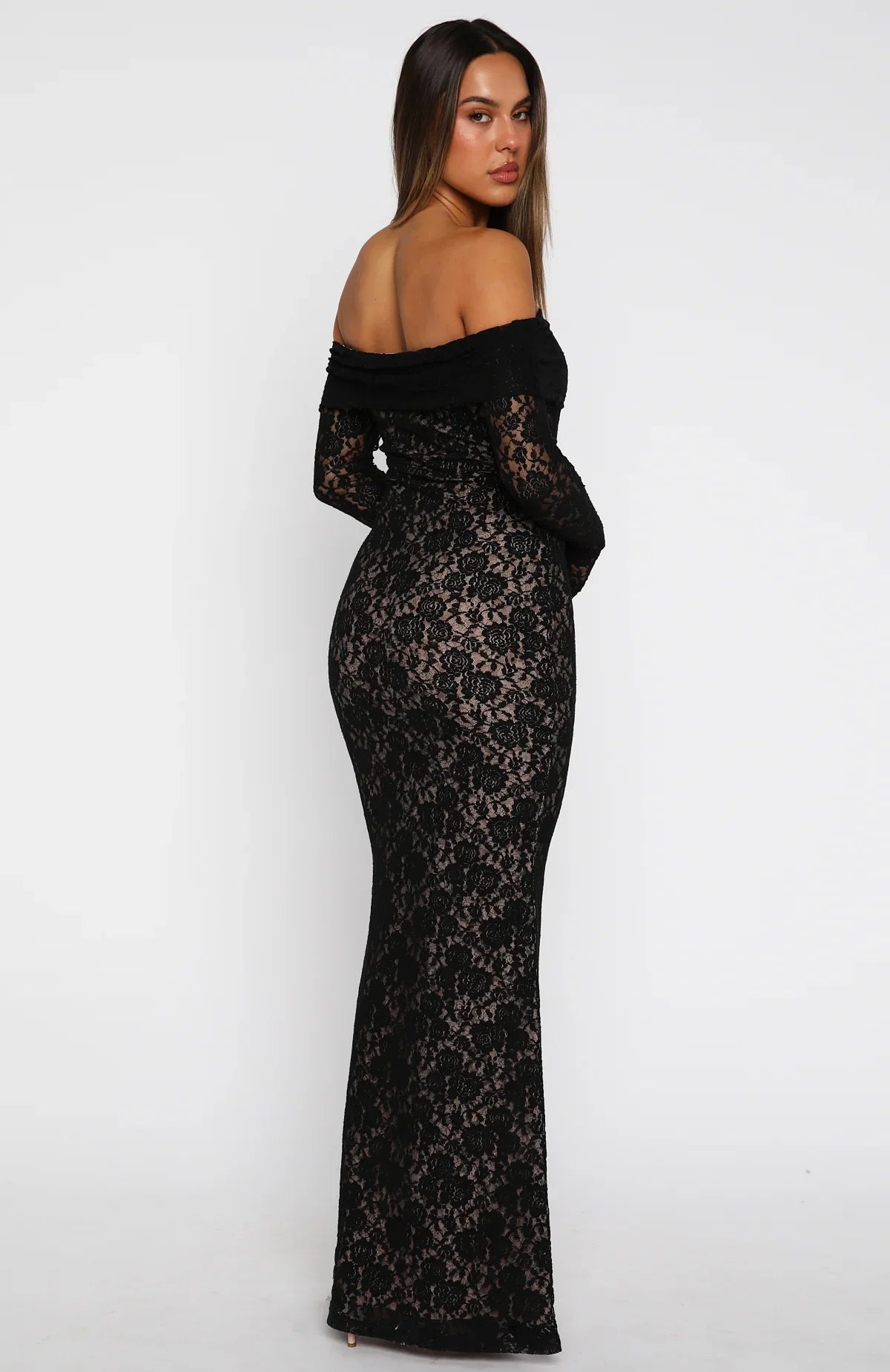 This elegant evening gown combines classic romance with a modern, sultry edge. The dress features a delicate floral lace overlay set against a contrasting nude lining, which beautifully highlights the intricate patterns of the fabric. The off-the-shoulder neckline is framed by a folded lace band, leading into sleek long sleeves that add a touch of sophistication. Its form-fitting column silhouette flows gracefully to the floor, making it an exquisite choice for formal galas, black-tie weddings, or upscale evening events.