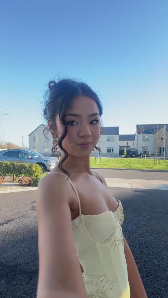 Detail: Intricate 3D floral embroidery, corset bodice, and delicate spaghetti straps